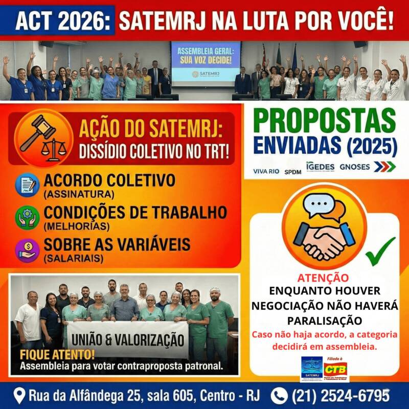 ATENÇÃO: Para participar, os Auxiliares e Técnicos de Enfermagem deverão se inscreverem no site do Sindicato www.satemrj.com.br, até o dia 25 DE MARÇO DE 2024, SEGUNDA-FEIRA, ÀS 10H.