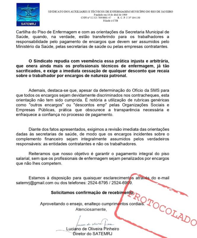 No entanto, o SATEMRJ tomou uma posição firme, encaminhando um ofício ao Ministério da Saúde para repudiar essa orientação e solicitar uma revisão urgente. Nós defendemos que os profissionais de enfermagem não devem ser responsabilizados pelos encargos que são de responsabilidade das empresas.