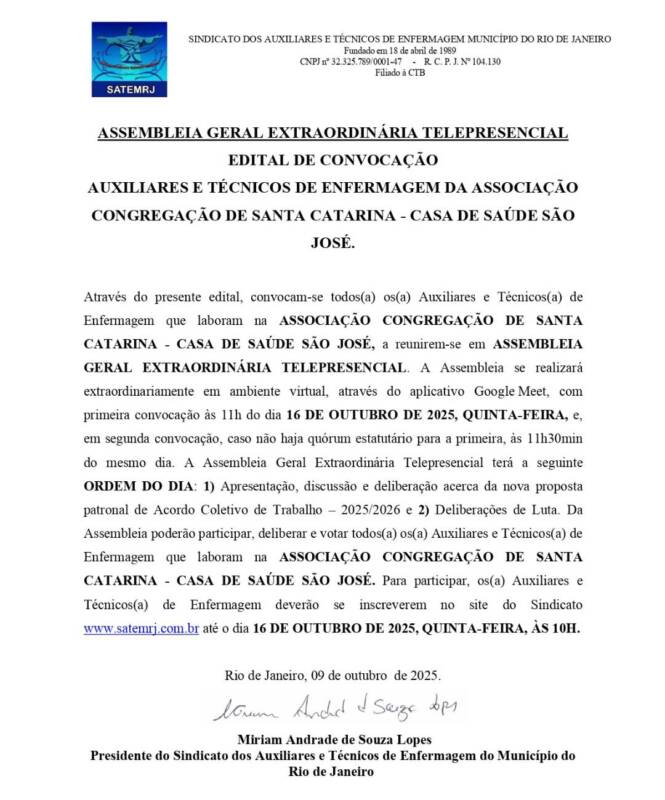 ATENÇÃO: Para participar, os Auxiliares e Técnicos de Enfermagem deverão se inscreverem no site do Sindicato www.satemrj.com.br, até o dia 16 DE OUTUBRO DE 2025, QUINTA-FEIRA, até às 10hs.