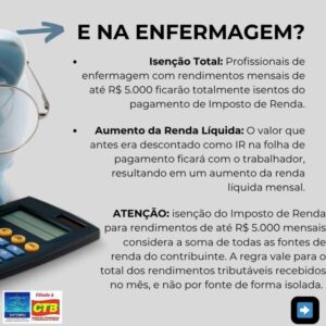 Para muitos profissionais da enfermagem do Rio de Janeiro, que hoje recebem salários abaixo desse teto – mesmo trabalhando dobrado em jornadas exaustivas – essa isenção pode significar um aumento real no valor líquido do contracheque!