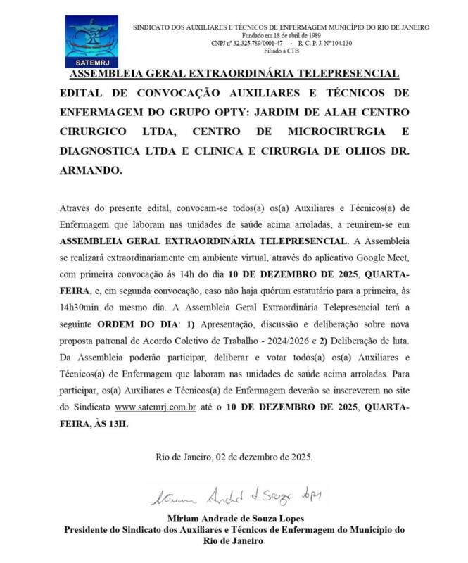 ASSEMBLEIA GERAL EXTRAORDINÁRIA TELEPRESENCIAL DOS AUXILIARES E TÉCNICOS DE ENFERMAGEM DO GRUPO OPTY: JARDIM DE ALAH CENTRO CIRÚRGICO LTDA, CENTRO DE MICROCIRURGIA E DIAGNOSTICA LTDA E CLINICA E CIRURGIA DE OLHOS DR. ARMANDO