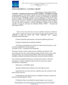 2️⃣ Sobre a falta de links para entrevista (Ofício 288): A Fundação admitiu falha sistêmica no envio dos convites e garantiu que está entrando em contato com os candidatos afetados para o reagendamento, sem prejuízo aos trabalhadores.