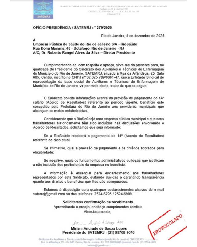Buscando garantir transparência e o cumprimento dos direitos da categoria, a presidente do SATEMRJ, Miriam Lopes, protocolou o Ofício nº 279/2025, endereçado à direção da RioSaúde. O documento cobra um posicionamento oficial e imediato sobre o benefício.