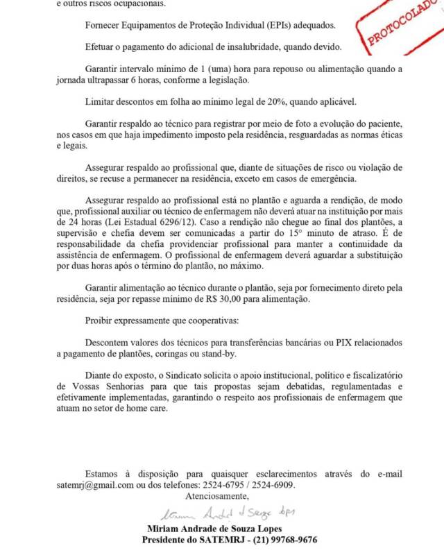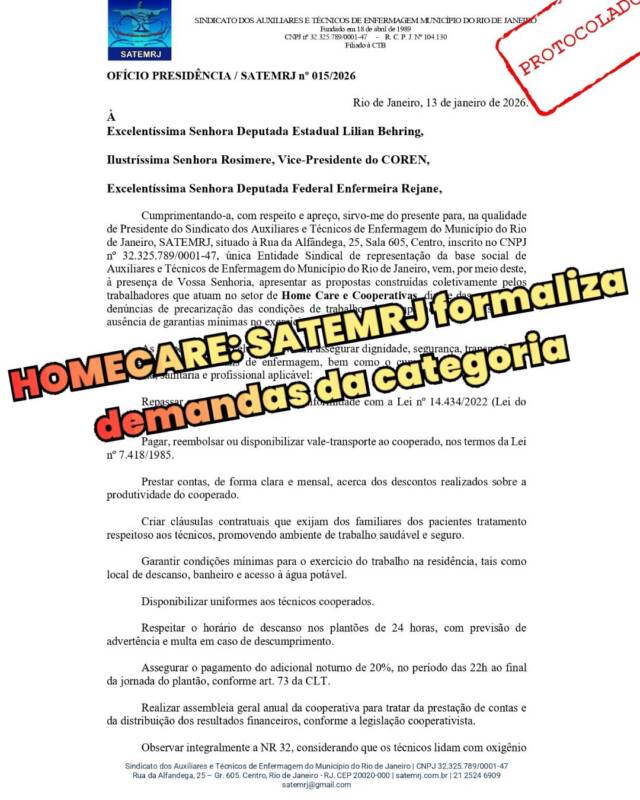 Principais reivindicações entregues: ✅ Pagamento imediato do Piso da Enfermagem. ✅ Garantia de Vale-Transporte e auxílio Alimentação. ✅ Local digno para repouso, banheiro e água nas residências. ✅ Pagamento de Adicional Noturno (20%) e Insalubridade. ✅ Fim de descontos abusivos e taxas para receber plantão.