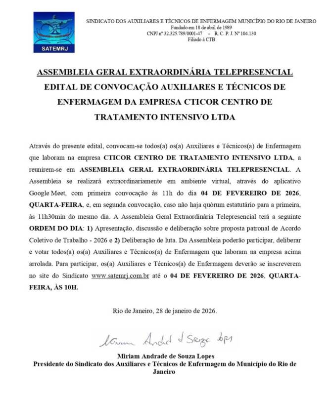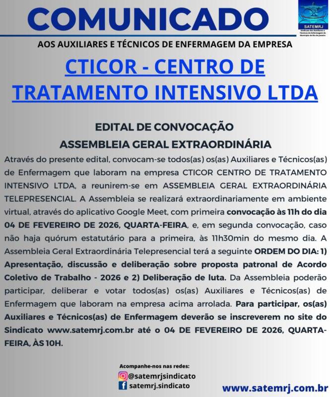 ASSEMBLEIA GERAL EXTRAORDINÁRIA TELEPRESENCIAL DOS AUXILIARES E TÉCNICOS DE ENFERMAGEM DA EMPRESA CTICOR CENTRO DE TRATAMENTO INTENSIVO LTDA