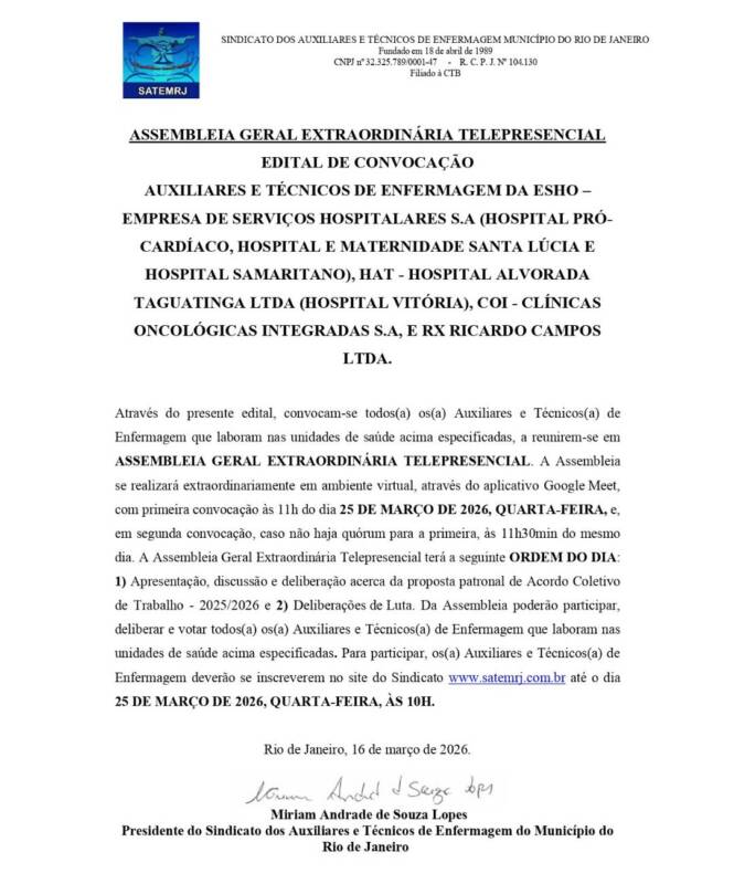 ATENÇÃO: Para participar, os Auxiliares e Técnicos de Enfermagem deverão se inscreverem no site do Sindicato www.satemrj.com.br, até o dia 25 DE MARÇO DE 2026, QUARTA-FEIRA, até às 10hs.