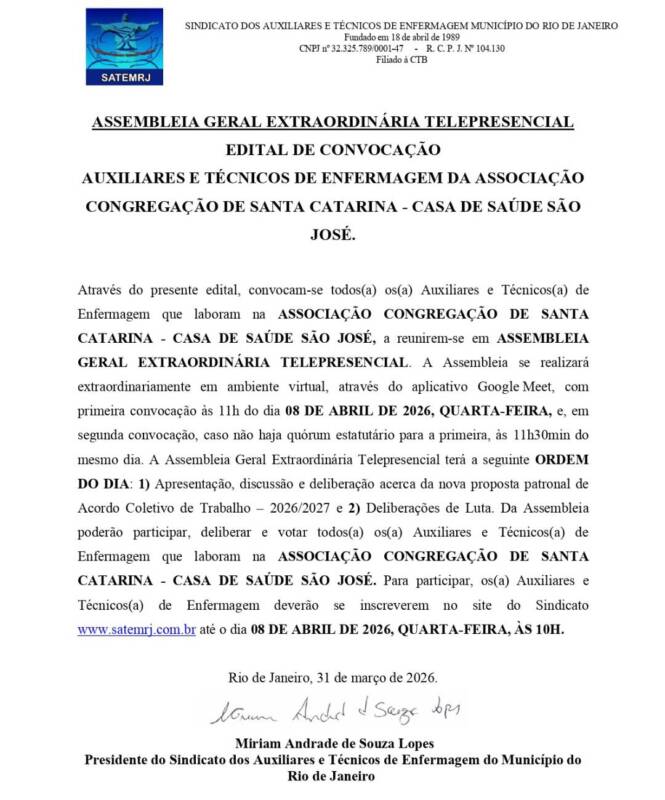 ⚡ASSEMBLEIA GERAL EXTRAORDINÁRIA TELEPRESENCIAL DOS AUXILIARES E TÉCNICOS DE ENFERMAGEM DA ASSOCIAÇÃO CONGREGAÇÃO DE SANTA CATARINA – CASA DE SAÚDE SÃO JOSÉ