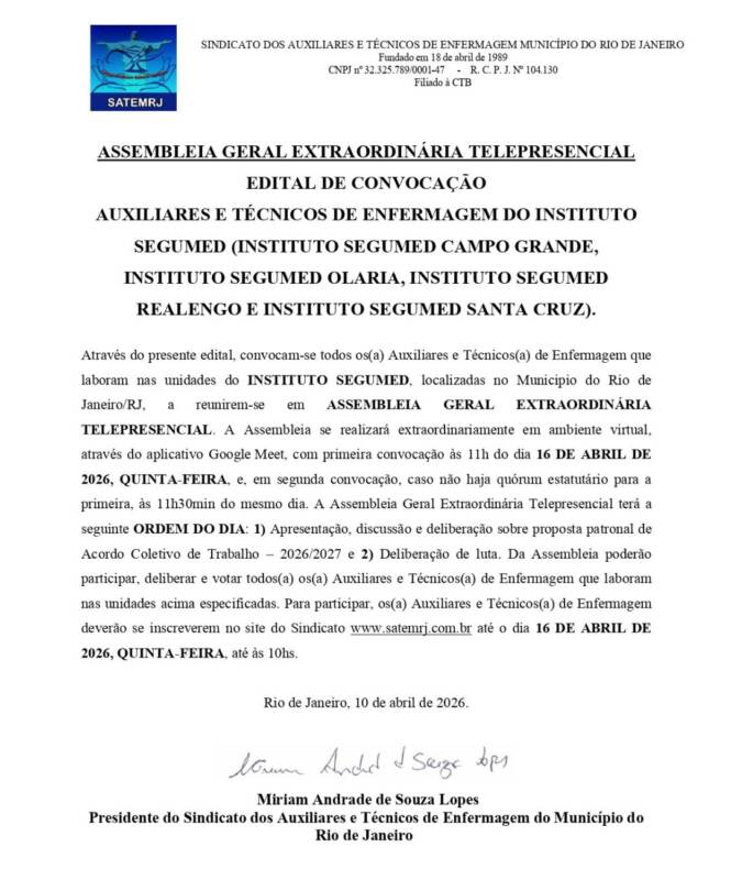 ⚡ASSEMBLEIA GERAL EXTRAORDINÁRIA TELEPRESENCIAL DOS AUXILIARES E TÉCNICOS DE ENFERMAGEM DO INSTITUTO SEGUMED (INSTITUTO SEGUMED CAMPO GRANDE, INSTITUTO SEGUMED OLARIA, INSTITUTO SEGUMED